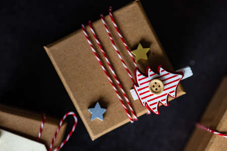 Christmas collection, gifts and decorative ornaments, over wooden background