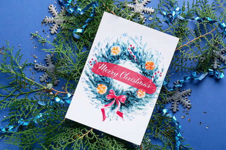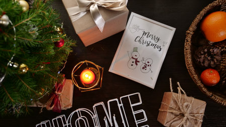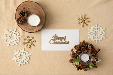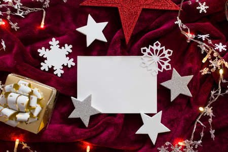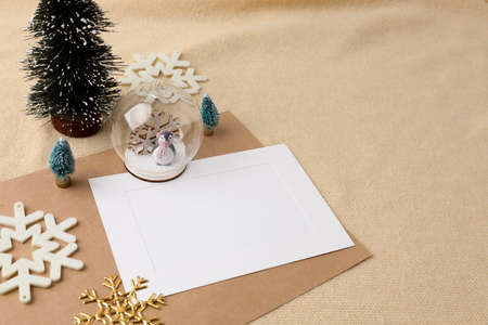 Christmas greeting card mockup with copy space. Top view, flat lay.