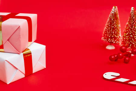 Christmas composition, gifts on red background, copyspace