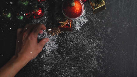 Christmas preparations, decorations on rustic wooden boards