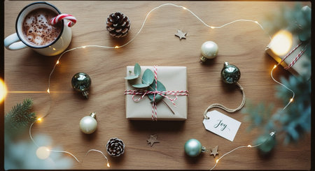 A beautifully wrapped gift with twine and a tag on a wooden table, surrounded by festive decorations like pine cones, ornaments, and fairy lights, with a cup of hot cocoa