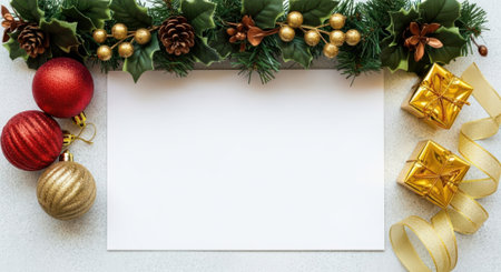 A festive Christmas scene featuring a garland, ornaments, and gifts framing a blank white space, perfect for holiday greetings or messages.