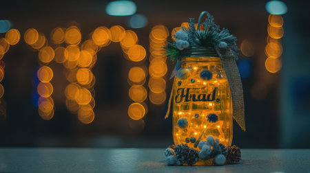 A decorative jar filled with lights, adorned with embellishments, set against a blurred bokeh background.