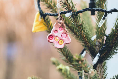Handmade and homemade baked cookie dough and buttons decorations on a Christmas tree outdoor. DIY creative ideas for children. Environment concept. Selective focus, copy space