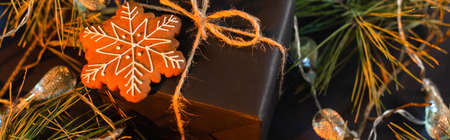 high angle view of wrapped black present with gingerbread cookie near green branches with garland, banner