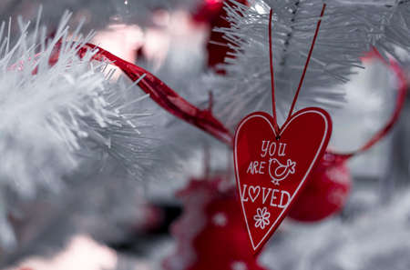 Beautiful Christmas red and silver balls on a white Christmas tree with decorations in the form of ribbons with the inscriptions Merry Christmas and Happy New Year