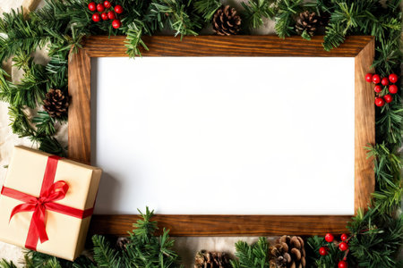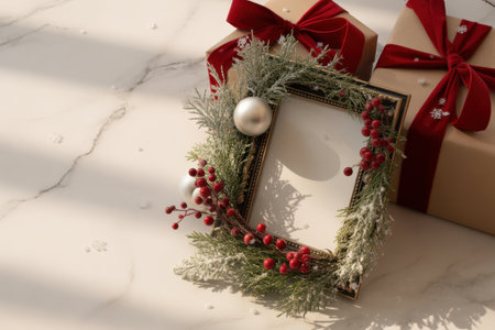 The a Christmas-themed frame adorned with red berries, pine decorations, and white pearl ornaments placed on a marble surface. Beside the frame, there are two wrapped gifts with red ribbons and snowflake patterns. The marble surface has a smooth texture with light and shadow reflections, enhancing the festive and mood of the scene.