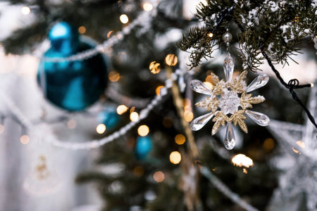 Beautiful festive snowflake decoration on the Christmas tree. Close-up. Beautiful Christmas background. The concept of decorations and decor for the new year. New Year's Card 2025