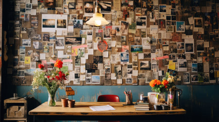 Assorted empty picture frames with decorative flowers and photos on light background. That the image is generated using AI.