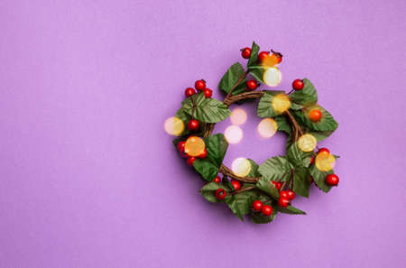 Christmas holidays composition with christmas decorations, red berries branches on purple background with copy space, top view