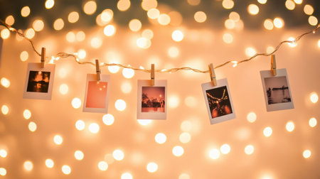 Hanging fairy lights with clothespins displaying polaroid prints on a soft wall