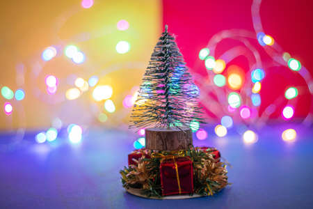 New Year background with a Christmas tree, gifts, balls and snowflake, Winter xmas holiday theme, Twinkle glitter bokeh light