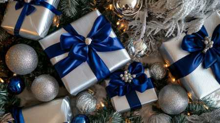 Top view of beautifully wrapped gift packages in silver and royal blue, with delicate satin ribbons, surrounded by sophisticated tree trimmings and shimmering ornaments. The scene radiates holiday elegance.