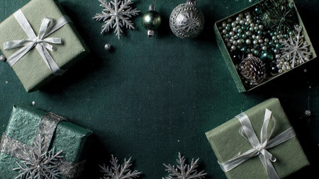 A contemporary green-and-silver layout with crisp ornaments framing a clean empty space.