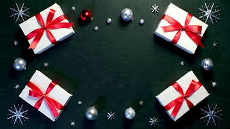 The a festive Christmas wreath with pine branches, red berries, and silver baubles arranged in a gold frame on a marble background. Two wrapped gifts with red velvet bows are placed beside the frame. Snowflakes are falling, adding a wintry touch to the scene. The overall mood is cozy and the holiday season.