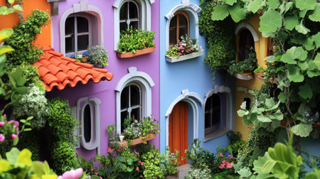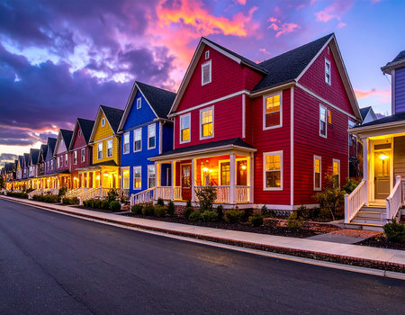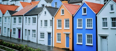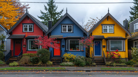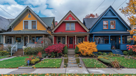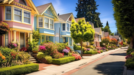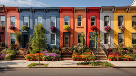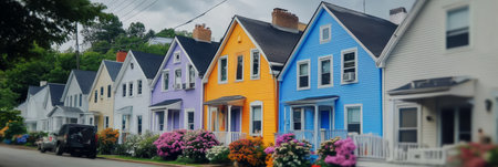 Charming Colorful Houses Row in a Vibrant Neighborhood with Flower Gardens and Modern Architecture
