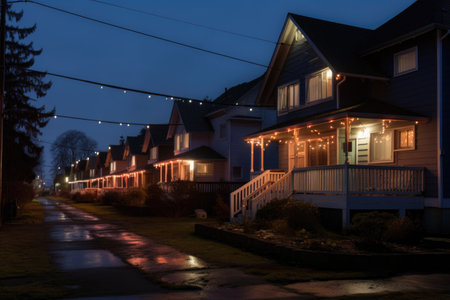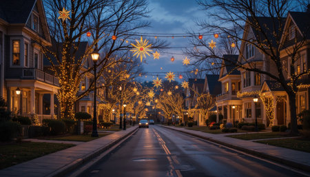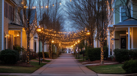 A picturesque street adorned with twinkling fairy lights creates a serene and inviting ambiance. Perfect for capturing evening charm and beauty.
