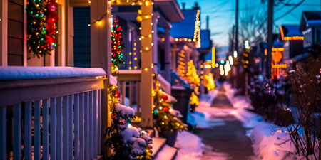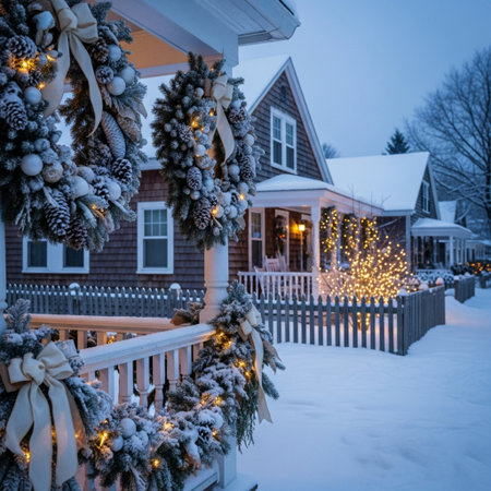 Two houses display Christmas decoration garlands with red bows and greenery on their facades. This scene captures the festive spirit of the holiday season in a neighborhood.