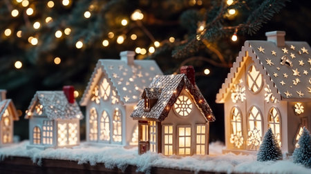 Small white houses of work with illuminated windows stand in the snow against the background of bokeh. Winter decoration. Shallow depth of field. Christmas banner or postcard. Generative AI