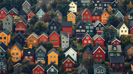 aerial view of suburban neighborhood with colorful rooftops, created with generative ai