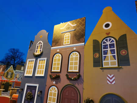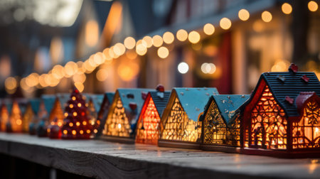 Christmas candle houses against bokeh lights background. New Year or Christmas celebration concept