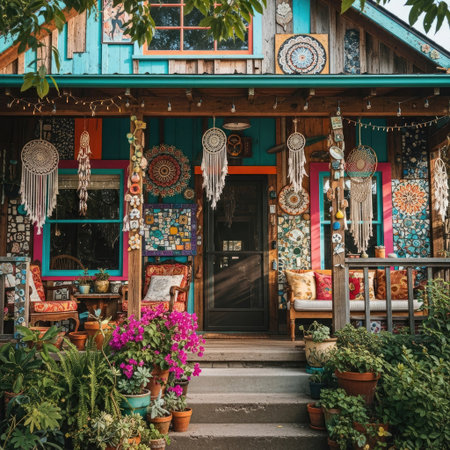 The image captures a vibrant bohemian-style home exterior adorned with decorative elements. Dream catchers hang from the porch, complementing the colorful facade and eclectic decor. Various plants and flowers add a natural touch. This versatile image suits editorial content and various commercial applications.