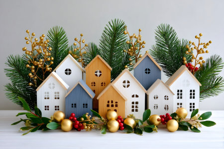 Decorative wooden houses arranging a winter landscape with festive ornaments and pine branches
