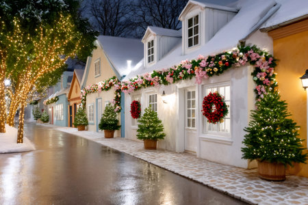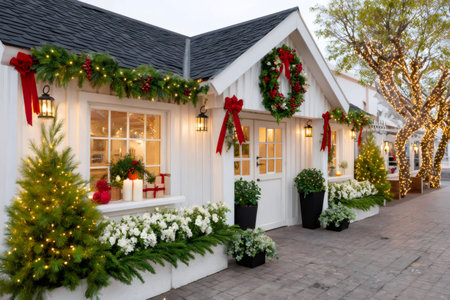 Charming exterior of a home or shop beautifully decorated for the festive season with garlands and wreaths