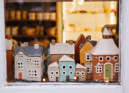 Miniature ceramic houses displayed in a shop window with warm festive lighting