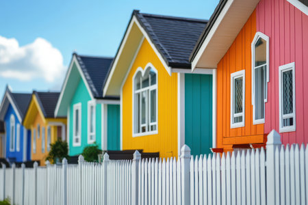 Brightly painted houses stand in friendly neighborhood, surrounded by white picket fences symbolizing community, homeownership, and revitalization.