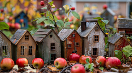 A row of small houses with apples in front of them. The houses are made of wood and are painted in different colors. The apples are scattered around the houses, some are closer to the houses