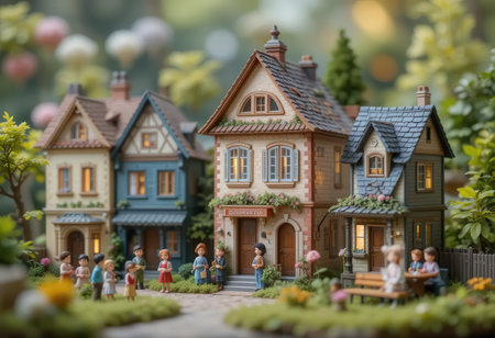 Delight in this charming miniature village scene showcasing beautifully detailed houses and people enjoying the outdoors in a vibrant, sunny environment.