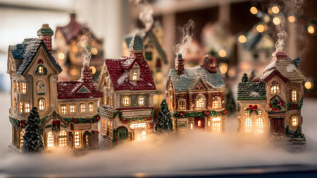 Twinkling lights adorn cozy houses, creating a magical Christmas village that sparkles with festive cheer and warmth in the frosty night.