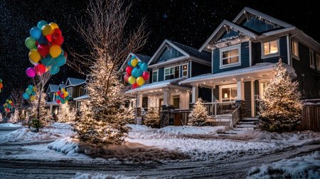 A picturesque winter night scene featuring snowy homes adorned with festive lights and colorful balloons, creating a magical holiday atmosphere.