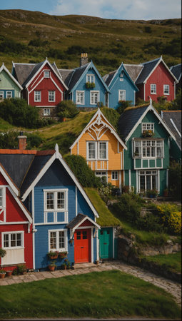 Discover a vibrant scene of colorful houses surrounded by lush greenery, showcasing unique architectural styles and cheerful colors in a serene setting.