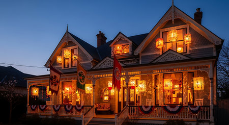 A charming historic house is beautifully illuminated with warm, inviting lights glowing from every window and porch, creating a cozy and welcoming atmosphere as dusk settles.