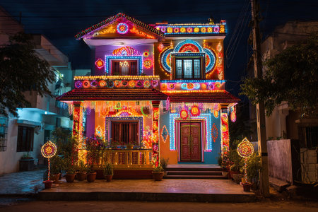 The house is decorated with colorful garlands outside for Diwali. Culture and Traditions. decorating the house for the holiday