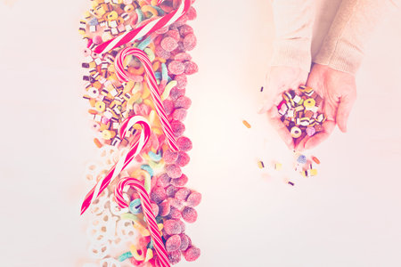 Knitted glove, funny glazed donuts, colorful dragee with raisins or peanuts inside, marmalade or jelly candies, striped caramel candies, icing or sprinkles on colorful background