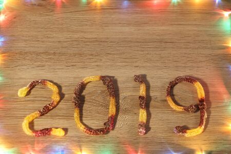 Fun frame with sweets on wooden table. Heap of twisted marshmallow
