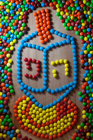 Hanukkah candle symbol made out of colorful round chocolate candy