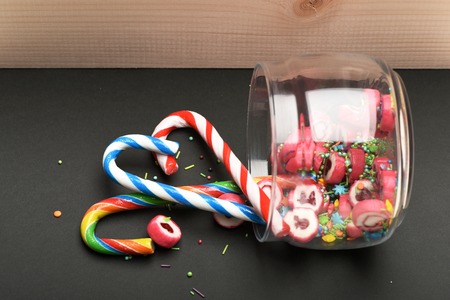 Set of striped and caramel candies with sprinkles poured from glass jar on black wooden background
