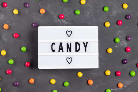 Background with scattered multicolored chocolate candy and sugar candy. Toned image