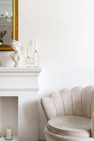 Close up shot of beige soft chair in classic style near decorative fireplace. Bust figurine, metal candlestick with candles and mirror with golden frame in living room with elegant interior design