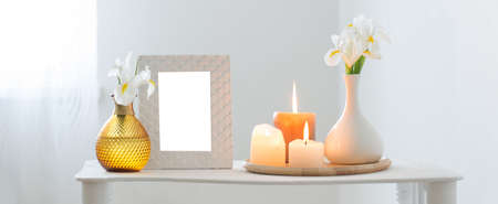 Close-up, Home accessories, candle, aroma diffuser, decor and copy space for product display on tabletop against modern loft wall with empty frame mockup. 3d rendering, 3d illustration