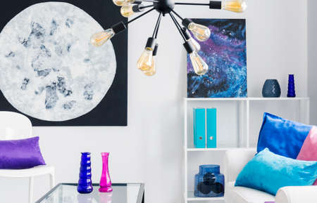 Moon and cosmos graphics on the wall of stylish white living room with colorful accessories, real photo