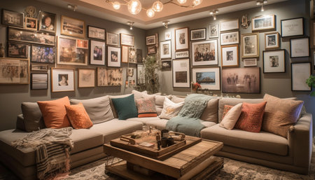 a gallery wall with a mix of framed photos and art pieces, created with generative ai