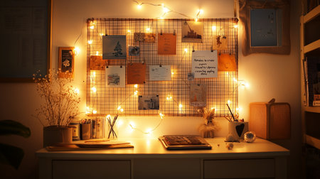 A cozy study space illuminated by warm fairy lights at night with a bulletin board filled with notes and artwork