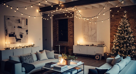 Interior of modern living room with christmas lights garland on wall