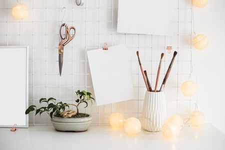 White home office room interior, bloggers workplace