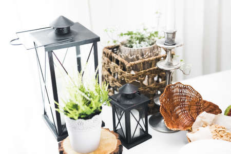 Interior of living room with decorative pillows, sofa, coffee table and plants